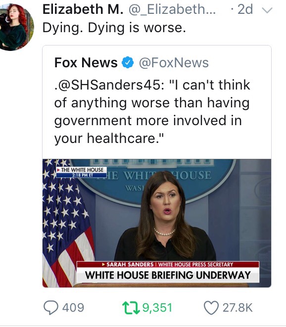2. Last week, White House Press Secretary Sarah Huckabee Sanders couldn’t think of anything worse than having government health care. A few possible options surfaced on Twitter.